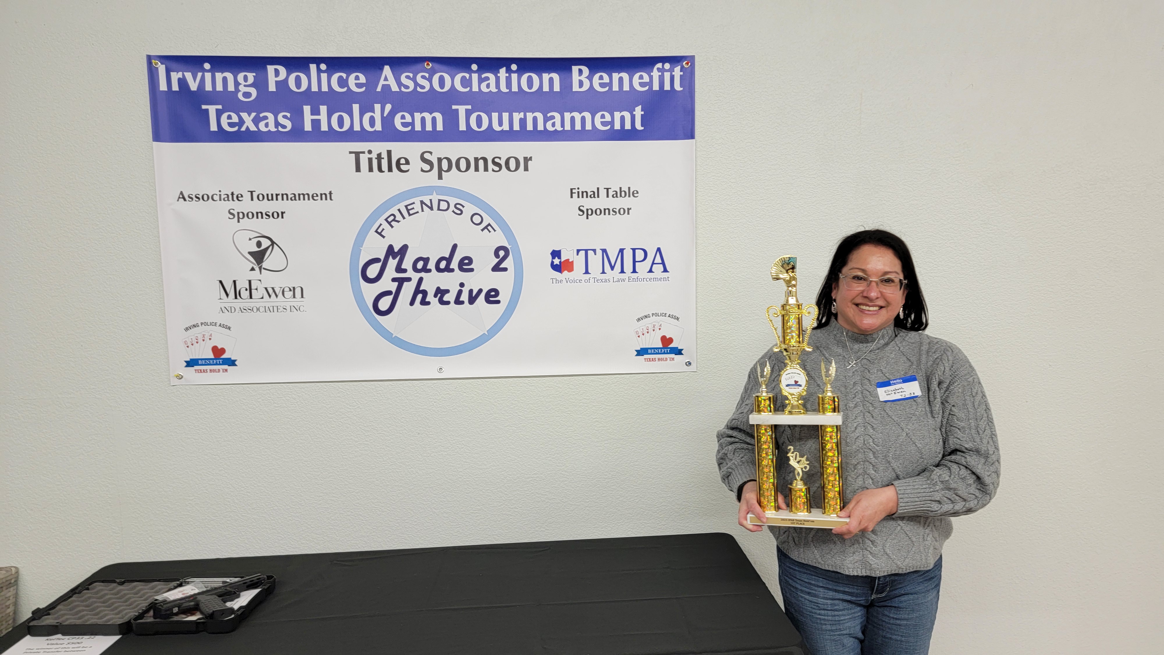 Benefiting Made 2 Thrive Special Olympic Team, Special needs baseball, and other IPAB Charities Don't think your skills are up to par? We can learn so much from these kids- Their MOTO: "Let me win, but if I cannot win, let me be brave in the attempt" This is a self-deal-friendly tournament. Come play, learn and better your skills, you just never know you may have what it takes! Time Check-in 2:30 Start 4:00 Location 1350 Meyers Rd, Irving Qusestions? Email methammond@irvingpoliceassociation.com Congrats to our 2025 Champ!